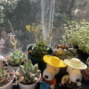 花粉と黄砂が酷いので窓は開けられませんが、東側の窓辺はみんなスクスク🌱花芽かなと思って毎日見ているうちにぐんぐん伸びて♪︎"(∩︎>ω<∩︎)"蕾ですね! 可愛い多肉さんとスヌさん🥰 🏷️毎月2日はスヌーピーの日 参加させて下さいなU^ェ^U