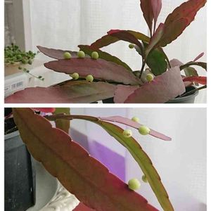 今朝の雨も止み 今はお日様が顔を出しています⛅ リプサリス ・ラムローサ🌵 小さな花のあとに実(種)が成っています 葉は綺麗な色を保ってますよ! 蕾は緑色ですが 段々 白くなってくるのかな~ 🌿゜゜゜🌿°゜°゜🌿。oO🌿