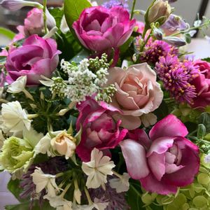 この春2番目に咲いたバラ ブルドゥパルファムと庭のお花で、ミニアレンジメント。 グリーンのスプレーカーネーションの茎が短かったので、オアシスを使って挿しました。 昨日ブルーベリーの花を鳥たちが食べに来るので、ネットを掛けていたら折れてしまった時の花や葉も入れてみました。 2枚目はプルドゥパルファム 3枚目はアルメリア バレリーナ 4枚目はスプレーカーネーション。