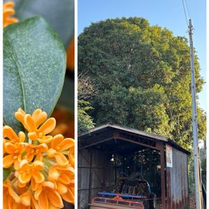 納屋より大きなキンモクセイ🌳✨ 👴🏻「40年前に引越してきた時、既にこのサイズだったんだもん、すごいよなぁ」 と、お隣さん。 👴🏻「それとも少しずつ大きくなってるのかなぁ?」 毎年、気になるので眺めにきています😆 蕪が美味しくて有名な、野菜の販売をされているお庭のキンモクセイ。 私の中ではNo.1のビッグサイズ。 去年の10月30日にも同じ木を投稿。そちらはもっと花がたくさん付いていました(投稿一覧→絞込み→2024.10)