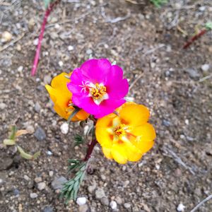 花壇で挿し木したマツバボタンが次々と咲いています。 1本で2色? と思って、よく見たら裏から1本出てて、支え合うように咲いていました。