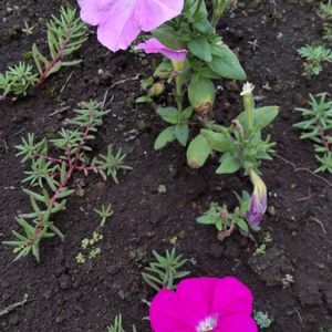 少し色の違うピンクのペチュニアです。 周りのスペースにマツバボタンを移植しました。