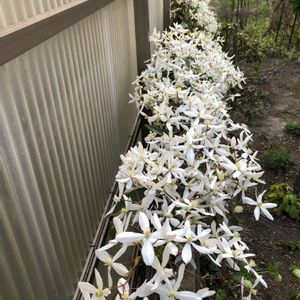 クレマチス アーマンディー💕 全部が開ききった〜🎶💕 毎日が気温が低く暴風警報が出て いてハラハラします。😅 気温が低いのでなんとか散らずに済んでいるようです😄💖