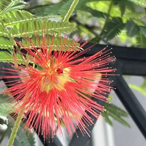 先程、ネムノキを載せましたが似ているお花 緋合歓(ヒネム)のお花。 本日は、1輪だけ咲きました。 こちらは真っ赤なお花が咲きます。葉っぱも夜になると閉じてネムノキと似ています。 ただ、寒さには弱いようなので鉢で育てています。