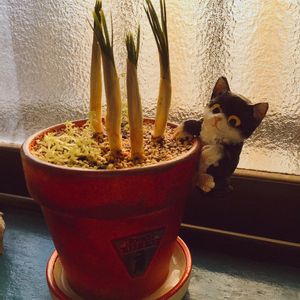 夕日の中のクロッカスを猫が見守ります 咲くのが楽しみです。