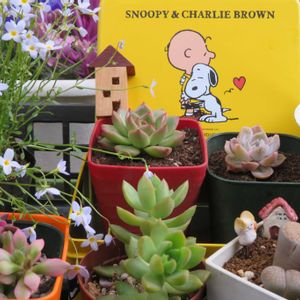 おはようございます😃 雨☔️降り 今日は楽しい 毎月2日はスヌーピーの日 🏷️ 多肉enjoyしてますか? 子持ち蓮華 もりもり計画実施中 まだまだ小盛りです😅 ヒナソウが 可愛く演出してくれてます🎶 毎月2日はスヌーピーの日🏷️ チームスヌー🏷️ 参加します♪