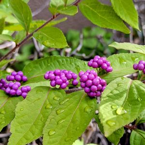 しなやかに伸びた弓状の枝に密集して実をつける「小紫(コムラサキ)」でおはようございます✨🌿💜☺️💜🌿✨ 淡い緑から徐々に紫色へと色付き始め、美しいプロセスで魅せてくれていました❣ "コムラサキ"は、日本を始め、朝鮮半島、台湾、中国等に自生するクマツヅラ科の落葉低木🇯🇵🇰🇷🇹🇼🇨🇳 良く似た"紫式部"よりも小ぶりで、葉の縁にある鋸歯が葉の上半分にのみあるのが、ムラサキシキブとの違いですね🔍✨ 病害虫に強く、比較的丈夫で半日陰でもよく育つ植物ですが、日当たりが良い場所ほど、より実つきが良くなります☀️🍃🌳🍃 …葉も実も少しずつ色づき始め、自然の変化はたゆまず確実に、彩りの秋へ🎶 ー花言葉は、「気品」、「愛され上手」…他。