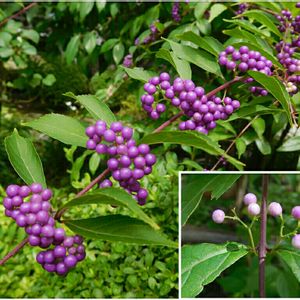 小紫(コムラサキ) シソ科ムラサキシキブ属の落葉低木。湿地などの近くに自生するが自生種はまれにしかなく、栽培種が逃げ出して野生化したものが多い。自家受粉により結実できるので実つきがよく、一般に市販されているものはほとんどが本種である。庭や公園に近縁種の紫式部(ムラサキシキブ)の名で植えられ、園芸店でもムラサキシキブといって販売されていることもある。葉は小さく、上半分だけに鋸歯がある。花期は6~8月。10~20個の淡紫色の花を葉腋の上部につける。花は雄しべ4本、雌しべ1本が突き出る。果期は9~11月。果実は核果。径3㎜ほどの球形で、葉の付け根より上につく。紫色を帯びた細い枝が長く伸びて枝垂れ、丸い果実が群がるようにつく。白い果実の園芸品種がありシロミノコムラサキまたはシロシキブと呼ばれる。 樹高3mほどの近縁種、ムラサキシキブに似るが、樹高が40~120㎝で小さいことが名の由来。別名のコシキブは、紫式部に対して、優雅な女流歌人として知られた『小式部内侍(こしきぶのないし)』にあやかってつけたともいわれる。また、ムラサキシキブは江戸時代初期までは実紫(ミムラサキ)、玉紫(タマムラサキ)、山紫(ヤマムラサキ)といい、その語源は紫の実が敷きつめられた『紫敷き実』であったようで、このムラサキシキミが変化してムラサキシキブになった。別の説として、紫色の実がたくさん成ることから『紫繁実(むらさきしげみ)』の転訛ともいわれる。他にも、植木屋が源氏物語の筆者『紫式部』にあやかろうと、ミムラサキの実の色にかこつけて命名したのではないかともいわれる。 よく似た紫式部(ムラサキシキブ)、藪紫(ヤブムラサキ)との識別点は次の通り 小紫 ・紫式部より全体に小形 ・葉は小形で若葉に毛がある ・花は葉柄からやや離れてつく ・果実は径3㎜で葉の上側にまとまってびっしりとつく ・茎に稜の出ることがある 紫式部 ・葉は無毛 ・花は葉柄の付け根につく ・果実は径3.5㎜でまばらにつく ・茎はまるい 藪紫 ・葉は裏面に毛が密生する ・花は葉腋に数個つく ・果実は径4~5㎜で葉に隠れる部分もある ・果実の半分を毛のある萼が包む ・茎はまるい 出典『木の実のガイド』『里山の花木 ハンドブック』『都会の木の実・草の実図鑑』