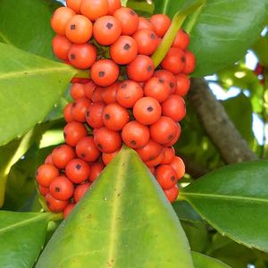 タラヨウ(多羅葉) モチノキ科モチノキ属の常緑高木 雌雄異株 別名 モンツキバ▪ジカキシバ▪ハガキノキ 自生地は、本州(静岡県以西)∗四国∗九州ですが、寒さに強いため、東北地方にも植えられているそうです。 同じ区内の神社 今年6月の初めに、青い実をつけていたタラヨウの実が、赤く色づいていました。