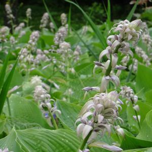 オオバギボウシ(大葉擬宝珠) キジカクシ科ギボウシ属 別名「トウギボウシ」「ハヤザキギボウシ」 「ウノハナギボウシ」「ウツリギボウシ」 「アツバギボウシ」 早春の若葉は山菜(ウルイ)として食用にされる。 玄関にて 22.07.17