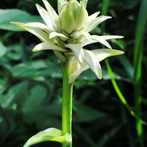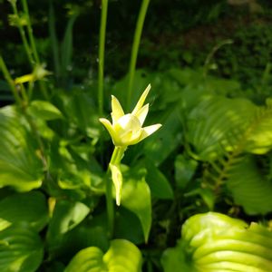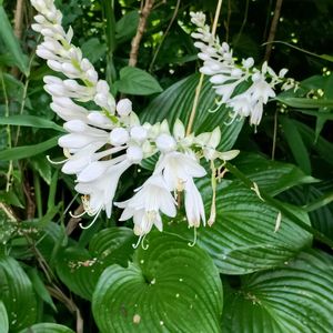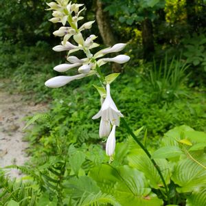 オオバギボウシ(大葉擬宝珠) ユリ科ギボウシ属の多年草 別名 ウルイ・ヤマカンピョウ・カエロッパなど 分布 全国の平地から高地まで。 住宅地のある山の麓の道端に、草などの茂みに混じって、白い花をたくさん咲かせて、重そうにしていました。 芽吹きの頃の葉は、古くから親しまれてきた山菜だそうです。 春になると、近所のスーパーに数種の山菜が並びますが、その中のひとつに「ウルイ」があって、 一度、食べてみたいと思いながら、高価なため、毎年、手を引っ込めていました😅 そのウルイが、このオオバギボウシだったと、初めて知りました。 「ウルイ」は、「潤い」の意味で、 湿った草地に生え、葉柄に水分が多いそうです。 人の顔くらいある大きなハート形の葉💚と、長い花柄が印象的でした😆