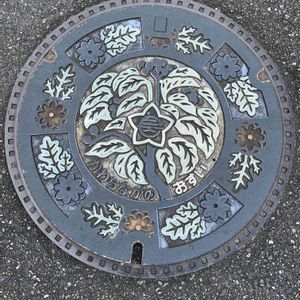番外編‼️ 樽見鉄道🚃十九条駅で下車 歩く、歩く🚶♀️ 役所を訪ねて 展示蓋を写真に撮り、カードをいただく😊 カードに記載の緯度経度あたりを探すが カラーマンホールを見つけられず😅 が、 アスファルトの亀裂やら枝やら草やらで彩られたそれなりにお洒落な一枚の蓋☺️ 4月6日 🤳