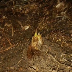 今年の筍第1号を発見😄 土が割れて少し盛り上がっている場所にあります。😉 我が家の竹林にて 3/22 9時撮影