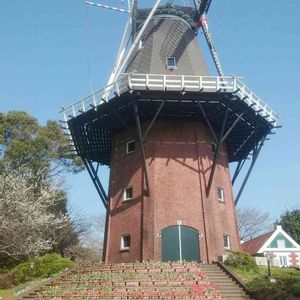 🌷と夢風車 オランダのデルフザイル市と姉妹都市提携を結んだ記念に、平成7年3月に風車が建設されました。 高さは24mあり、🌃はライトアップされます。😊 永源山公園にて 3/23 14時52分撮影