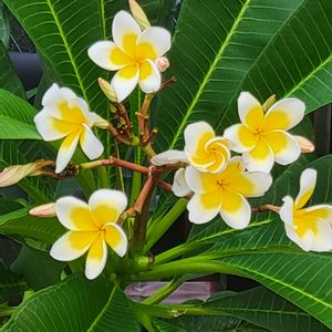 お初の子が、とあるお宅の玄関先で咲いています🟡 隣にいた妻が、プルメリアだね、と😆