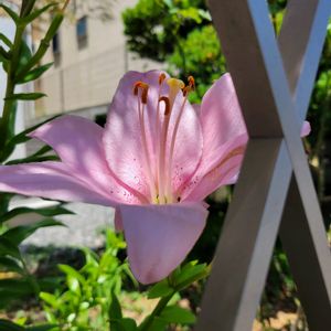 優しいピンク色のユリをどうしても撮りたくて、フェンス越しに📲① 高みに咲いていたので下から🤳②