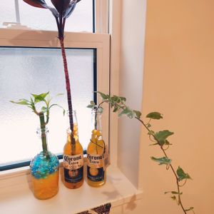 夏に作ったコロナの寄植えを解体して、瓶を再利用✨ 切り花のドラセナとアイビーを挿して2ヶ月…発根してくれたのでこのまま育ててみます✨