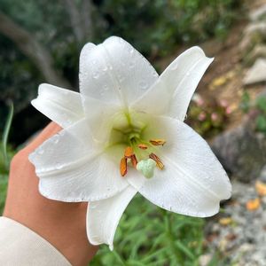 豪雨の後… テッポウユリの花が咲きました…🤍 パイナップル🍍リリーは 今年も咲きそうにないですが 代わりにテッポウユリの花が 見事にパイナップル🍍リリーの花のよう… 🤣