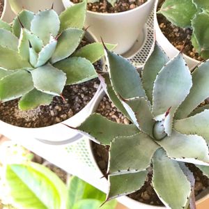 葉のフチに、白いラインとノギが入ってる子達♡ 右の名無しだった子、最近、ジェスブレイティと判明! ありがとうございました! *アガベ ・ロファンサ 12.8 *アガベ ・ジェスブレイティ 12.8