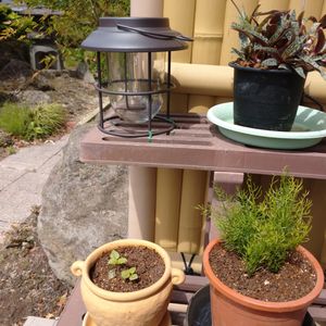 和と洋だわ~笑 勝手に生えたシリーズの「コキア」「レモンバーム」移植してみました。合ってるのかはわかりませんが…全て再利用品でSDGsですね!(テキトー)