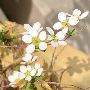 今日のお花 ユキヤナギ 白くて小さなお花 好きですꕤ.。🌿 4️⃣ 背景の黄色いは 菜の花です💛