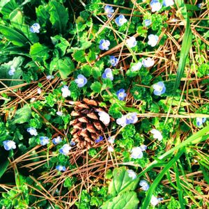 出勤の途中で、オオイヌノフグリの中に松ぼっくりを、水元公園の近くで、見つけました。