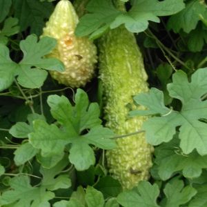 出勤の途中で、花壇にゴーヤが丸いのと長いのが、並んでいました。