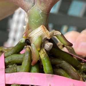胡蝶蘭がやっと動き出し、 新芽と根っこが出てきた! 根っこは枝分かれするような感じで出てきている。