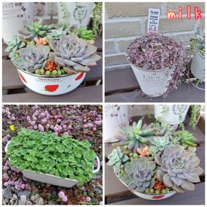 🍓 お義母さんのホーロー容器寄せ ··· こちらにもジャシリー入れました〜(*´艸`)💕🎶⸒⸒ 🍓ハートカズラ ··· 初めて植え替えました〜(๑˃̵ᴗ˂̵)و !モリモリしてくるかな〜( ¨*)? 🍓アロマティカス ··· 伸び放題だった子たちをカットしました✂️スッキリしたね〜(*^^*)