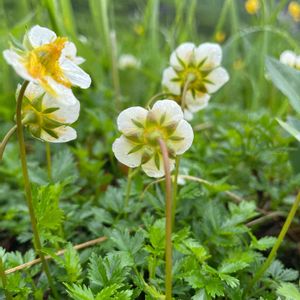 コガネイチゴ(黄金苺) バラ科キイチゴ属 灌木の下で真っ白な花が目立ちました🤍 亜高山の針葉樹林内や高山のハイマツの下などでみられる常緑多年草。 名は光沢のある赤い分果の形を小判に見立てたそうです。