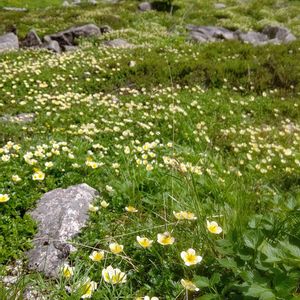 シナノキンバイ(信濃金梅) キンポウゲ科 県内(長野県)に多い花なので、この和名となった。 葉は大きく5裂しさらに裂けている。黄金色の花弁は径3.5~4.5cmで萼片が変化したもの。光沢はなく形は不揃い。 高山にしか咲かず、黄色い他の花にくらべて大きい花なので区別は簡単。