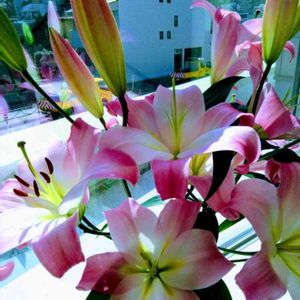 病院の窓辺に咲く、ピンクのユリの花です。 ユリの真ん中を、撮りました。