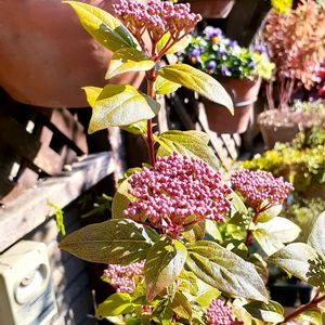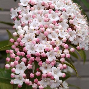 【ビバーナムティヌス】 《レンプクソウ科》 花言葉 「誓い」「茶目っ気」「私を見て」 別名 トキワガマズミ ピンク色の蕾と白色の集合花を数多く咲かせ、花姿はあじさいのようで甘い香り。