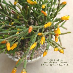 🏷️棒の日に参加します😄 見切り品で購入したリプサリス☘️ イマイチ魅力がわからないまま、 冬もお外の棚の一番下に😆 「萎んだら水遣り」を繰り返し、気が付いたら黄色い蕾が付いていました❤️ びっくりするやら、嬉しいやら😄 どんなお花が咲くのか嬉しみです🤗 syamunekoさんと、がじゅまる子さんに ☘️猿恋葦☘️と教えて頂きました🙏 ありがとうございました🤗