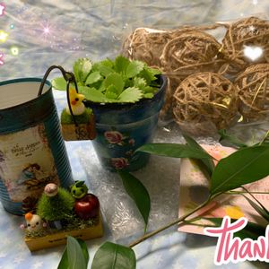 タニ友さんから素敵便が届きました。💓 子宝草、と挿し木用のガジュマル、リメ鉢とリメ缶、麻紐のイルミネーション、ドルフィンネックレスと、可愛い置き物です。 どれも素敵です。💕💕 タニ友さん、ありがとうございます。☺️✨