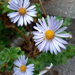 【ダルマギク(達磨菊)】 日本原産、キク科多年草 本州西部と九州北部の海岸の岩場などに自生する。 海岸の岩上に咲く様子がダルマが座っているように見えるところから名付けられたとか、丸い葉をダルマに例えたなどの由来がある。 花のつく茎はよく枝分かれして高さ約25㎝になり、径3~4cmの頭花を枝先につける。頭花は淡い青紫色の舌状花と黄色の管状花からなる。 葉はロゼット状につき、全体が毛に覆われているため白緑色をしている。 草丈:20~35cm 開花時期:10~11月 花色:淡青紫色、白色 山口宇部空港