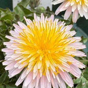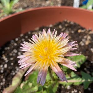 蕾でお迎えした緋紅たんぽぽが咲きました💕 この子もオザキフラワーパークで出会った子です。 外側の花びらがほんのりピンクで中央が黄色のちょっと変わったたんぽぽさん✨ とても可愛らしいです❣️