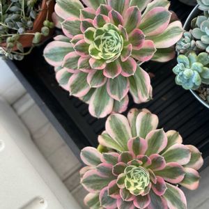 子株ちゃんの曙斑が可愛らしい センペルビウム・バニラシフォンさん😻💚❤️🤍🩷 去年の強烈な夏で減らしてしまい植え替えしたお嬢様とお子様です😺 大きい鉢に移したいけど まだ暫く出来そうに無いです🙀💨(外壁工事中💧)