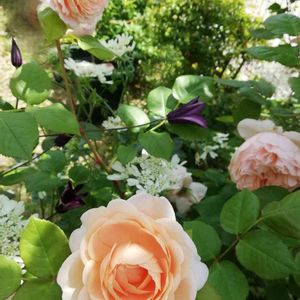 バラとクレマチスとオルレアのコラボ✨ …を演出するために、まだ蕾なのに無理やり引っ張り出されたエレガフミナちゃん😂