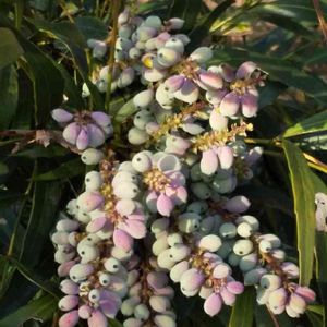 これもお花の寺にて。 細葉ヒイラギナンテンの実でしょうか! これからぶどう🍇色に変わるようです😲🎶 お花の寺には、梅、河津桜🌸、椿、足もとにはアイリスみたいなお花や黄色いお花もあちこちに咲いていて早春を感じました。 もう春ですね〜🤗🎶