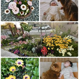 🐈⬛ニャンニャンの日🐈⬛ 💕参加しま〜す🎶 14歳のモコ(ソマリ)は孫にも優しい お母さん代わりもしてくれる♂猫です🐈 すっかり仲良しさん💞 左の上下はオステオスペルマム 中段は夕刻の門へのアプローチ風景です ラックスもあとどのくらい持つかなぁ??? ラックスに隠れて成長中の宿根草たちもお花カット✂️したら陽を浴びれるんだろうなぁ・・・ この風景✨名残惜しい😿