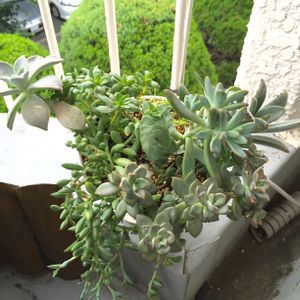 わが家に来た最初の多肉寄せです。 室内→ベランダの明るい日影に したんですが、 私が一番よ!イヤ俺が一番だ!と 言い合っている様に徒長してます。 最初は隙間無くモリモリだったのに… 初心者ゆえの「切れない…」結果がコレ。 徒長したらピッチしてって 「育て方」に書いてあったのに。 でもイイんです! もう少し勉強してから 仕立て直してあげるZ! いつの事やらわからないけど…