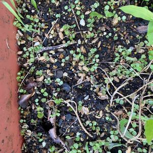 綺麗でなくてすみません。 だらしなくなったビオラを片付けたら プランターいっぱい、発芽していました。 どうしたらいいでしょう… 育てられるかなぁ…