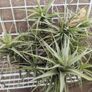 おはようございます。格安でやってきたチランジア ベルゲリの雑種です多分。 開封したとき予想より大きくてびっくりしました。クランプ状態ですがそのままにするか、バラして細長い流木にペタペタつけようか考え中です。 とりあえず根元の枯れた古い葉をせっせと剥がし、蒸れないようにスッキリさせました! こういうのは下向きにぶら下げても問題ありませんか?自分から上に向かうかな🙄? 根元を縛ってまとめたかったのですが、なかなかうまくいかず、どうしてもプランプランしちゃうので、一旦水やりしてかごに置きました。