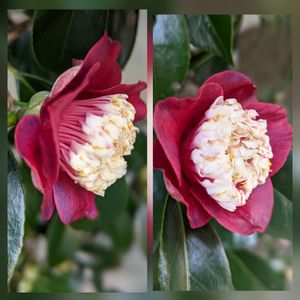 いとこが送って来た写真です。 椿っぽいですが、なんでしょう? 分かる方、お願い致します🙇 ✳️CCGさんに、卜伴椿(ぼくはんつばき)と教えて頂きました。 ありがとうございました🍀😌🍀
