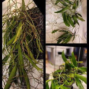 Thrixspermum leucarachneさん😊 我が家の少年の学校行事があるから仕事休んで、、、午前は暇だから朝から早速ランいじり😳✨🌿 左のボウボウ暴れ株を右上の状態に分解、根の整理をして悩んだあげく右下のような感じに植え替えた😅💦 この株はこの間のサンシャインでお迎えした輸入直後の株なのだけど、水をかけていてもやはり水分不足?で葉にシワが出てきていたので、ボウボウの根をそれなりにまとめてぐるっと鉢の中に入れ込み、隙間をベラボンでうめてみた。これで少しは根が保湿されるかな? 鉢は数年前のドームで台湾の蘭屋さんがらカトレア買ったときの黒いスリット?入ったプラ鉢に持ち手の針金ついたやつ。捨てようと思ってたけど、おもわぬ所で使い道ができてよかった😳🎵 このランはホワイトスパイダーと呼ばれるようで、ブラッシアのような?白く細長い蜘蛛のような花をつけるらしい。