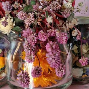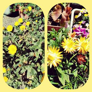 左上から時計回りに。 ●ビオラはお顔を皆こっちに向けて可愛いらしい💕 ●まだまだ咲いてくれてますハイビスカス。 ●確か、ロココって名前だったコロンコロンして可愛いらしい花、ドライ向き。 ●お迎えした、テディベア ●バーガンディアイスバーグは花数は少ないけども良いお色です、裏が白いなんて珍しいバラですネ。