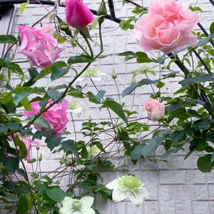 ロココ。玄関に長いツルを誘引してもらい花がどんどん上がってきました、とてもいい香りデスヾ(๑╹◡╹)ノ"