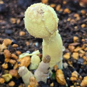 「コガネキヌカラカサタケ」 9月8日am5:52頃 ✧p📷qω•,,´)パシャ✧ マーガレットのストロベリーホイップの鉢にキノコ🍄が出現‼️ 根元の方には、小さなキノコも出来ているみたいです。 このキノコ、直ぐに消えてなくなるらしいです。 大きいのは、4日目にして消えました。 また名前が色々あって、 お釈迦様のキノコ」や「幸運のキノコ」とも呼ばれることがあるそうです。