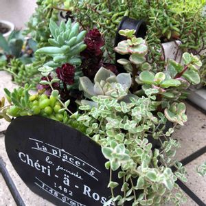 暑いなか何をやってるんだか、寄せ植えしました😂 ずっと欲しくてげんげんちゃんに代狩りしてもらったせばすたんさんのデニム鉢(///∇///)✨ 植える多肉がいなくてすぐ植えれませんでしたが、秋まで我慢できず😓 小さめの工具箱を解体しました! もともとゆとりある植え方してたので、このサイズにもりもりで植えるとちょうどの量になりました❤️ 葉挿しっこも使ってこんもり山型にヾ(*≧∀≦)ノ゙ デニムのかっこいい感じとラブリーな多肉で、私の好きな甘辛mix寄せに(*´∀`)♪ ジャンクなikuraさんの雑貨と、PUKUPUKUさんのピックも♪ ジャンクもラブリーも大好きだけど、かっこいいとかわいいを混ぜたのが一番好きです( ≧∀≦)ノ 使った多肉 ホワイトミニマ ピンクザラコーザ タイニーバーグ 紅モンロー デビー 樹氷 小米星 レモータ グリーンペット